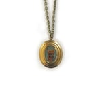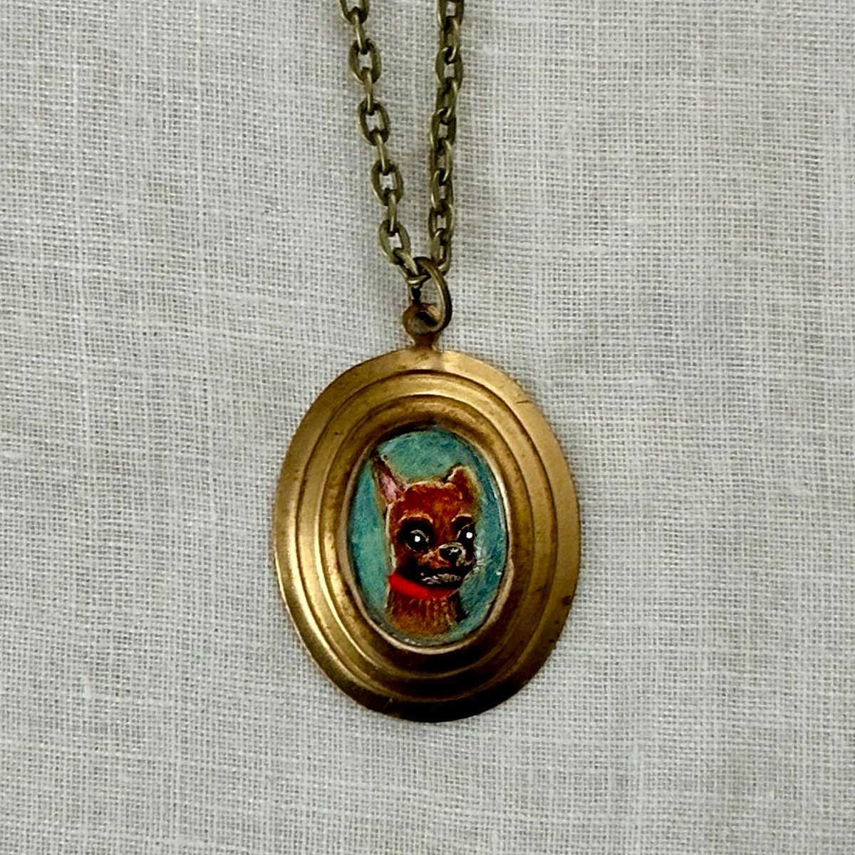 Tiny painted 1 x .74 inch charm with varnished finish. Hangs on an 18 inch antiqued bronze chain with lobster claw clasp.