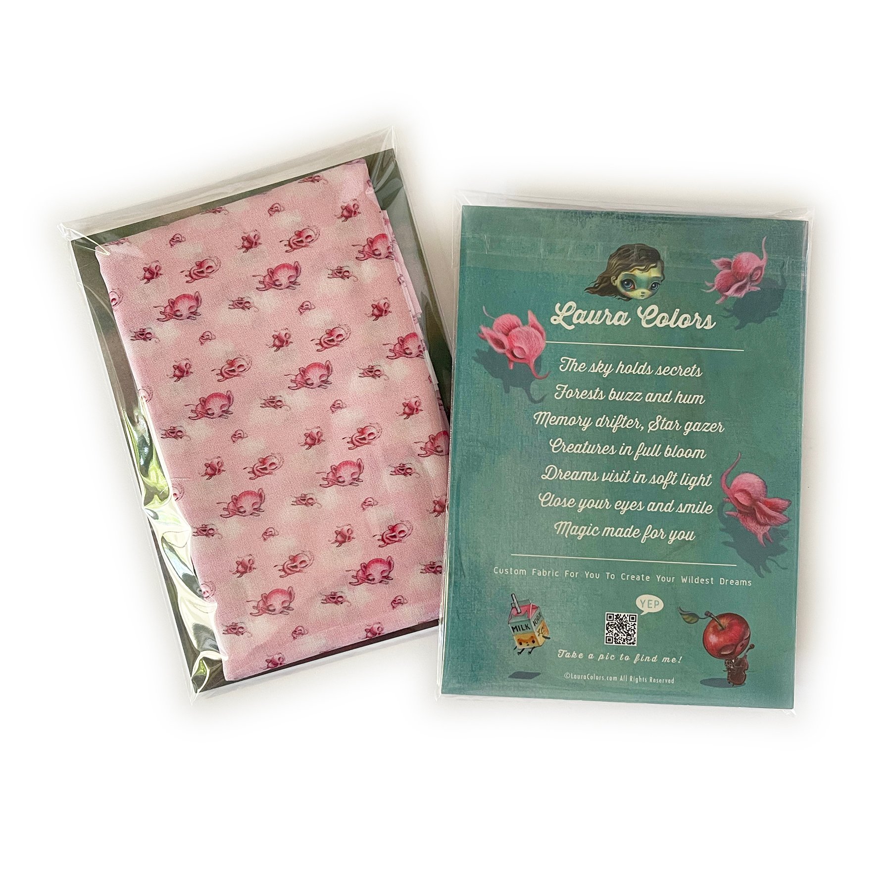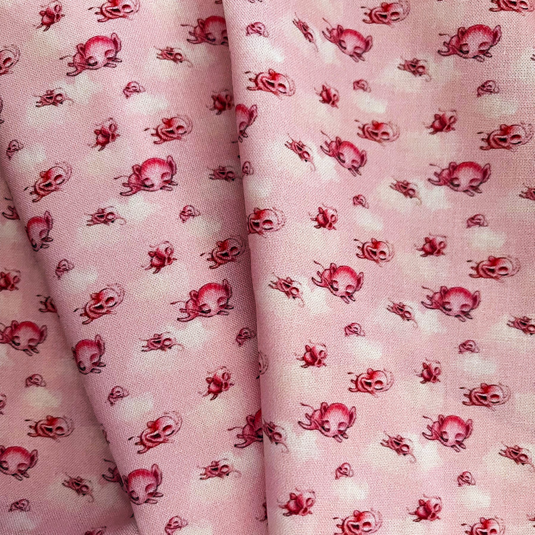 Dream Float is a small scale fabric design by Laura Colors featuring flying pink elephants in a light pink sky. Printed on 100% cotton, each fat quarter measures approximately 18 x 21 inches. The fabric has a 120 thread count with minimal shrinkage of about 5 - 6%.