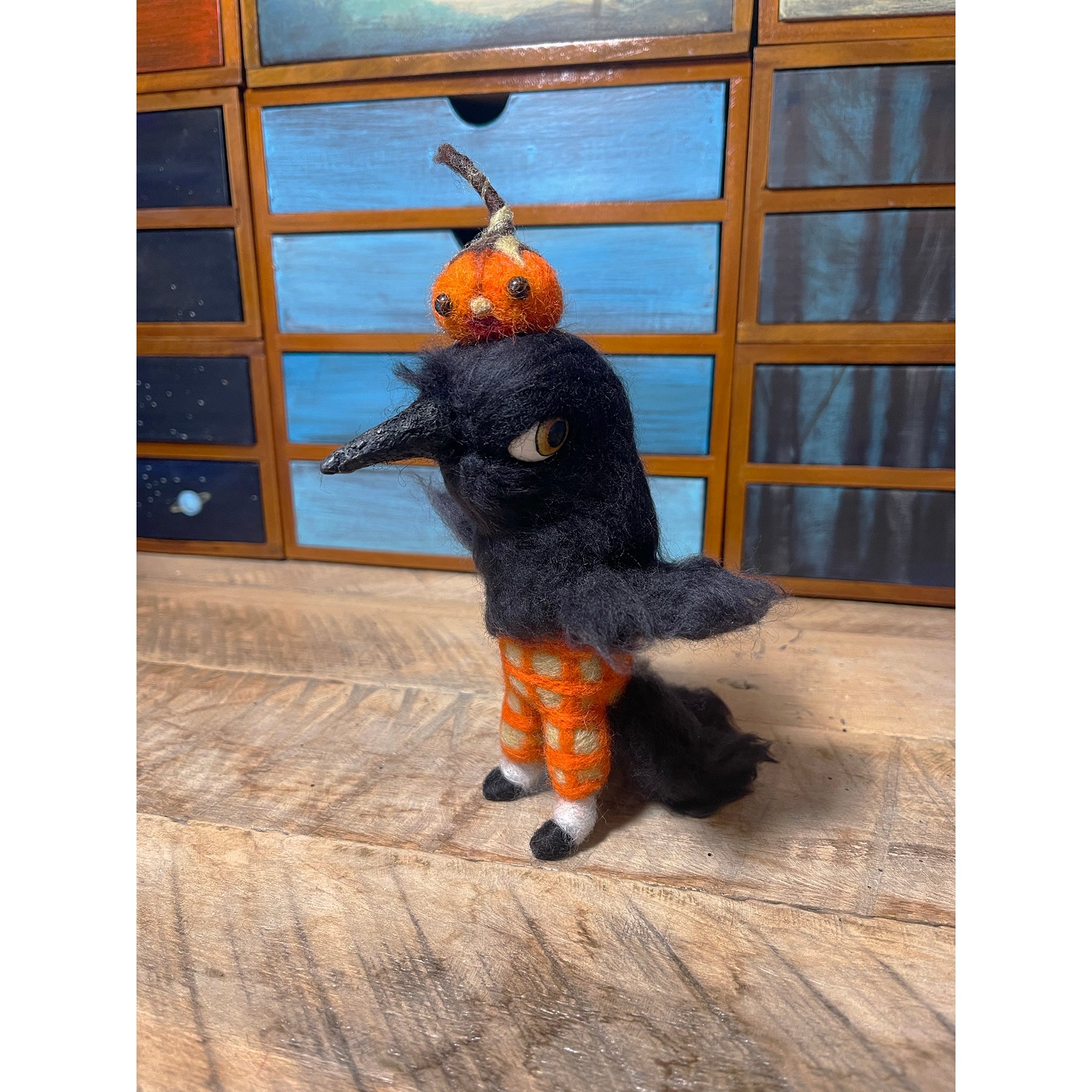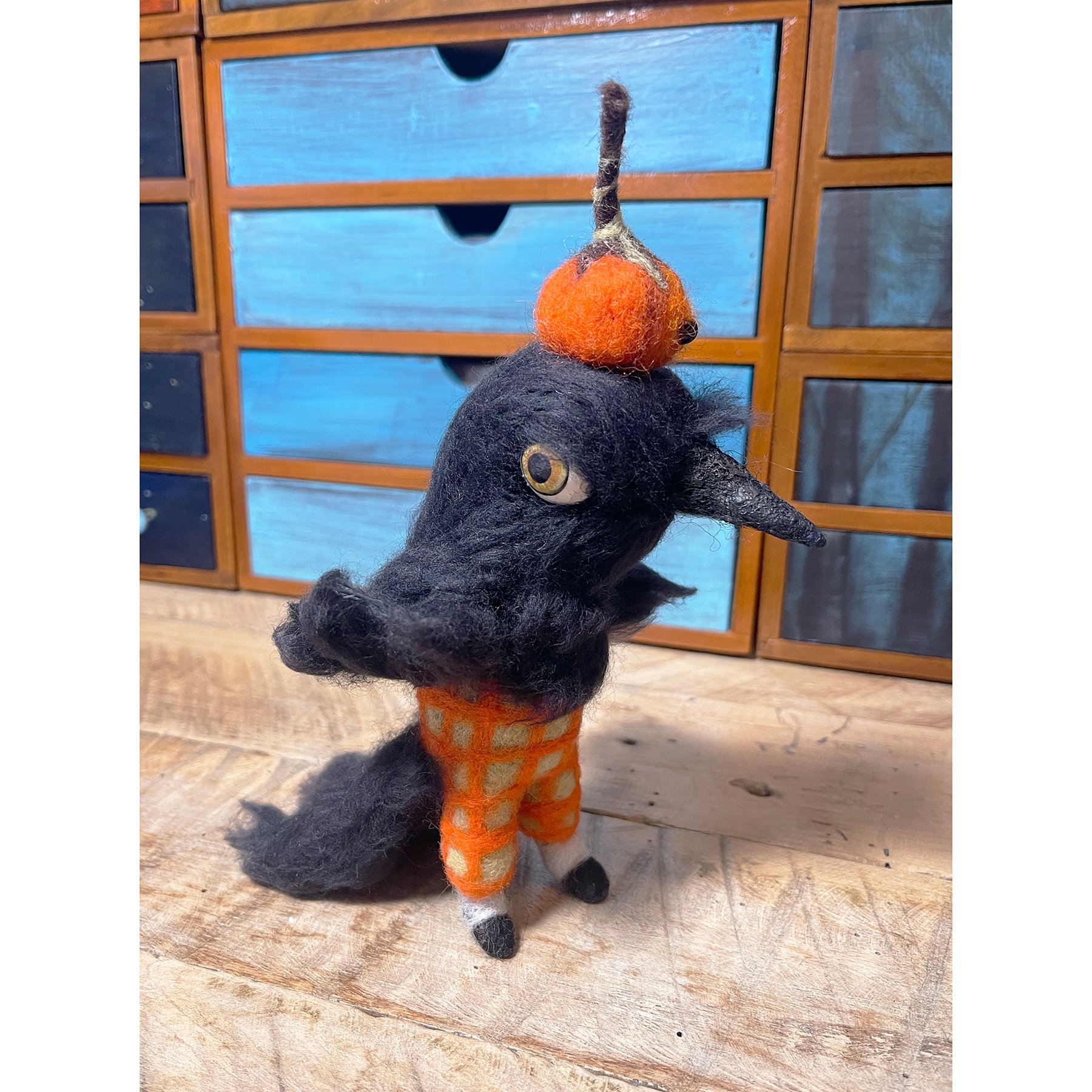 Edgar is made of wire, wool, and wax with hand painted wooden eyes. Edgar is approximately 8 inches tall including the pumpkin he's wearing atop his head and is gently bendable.