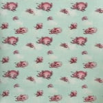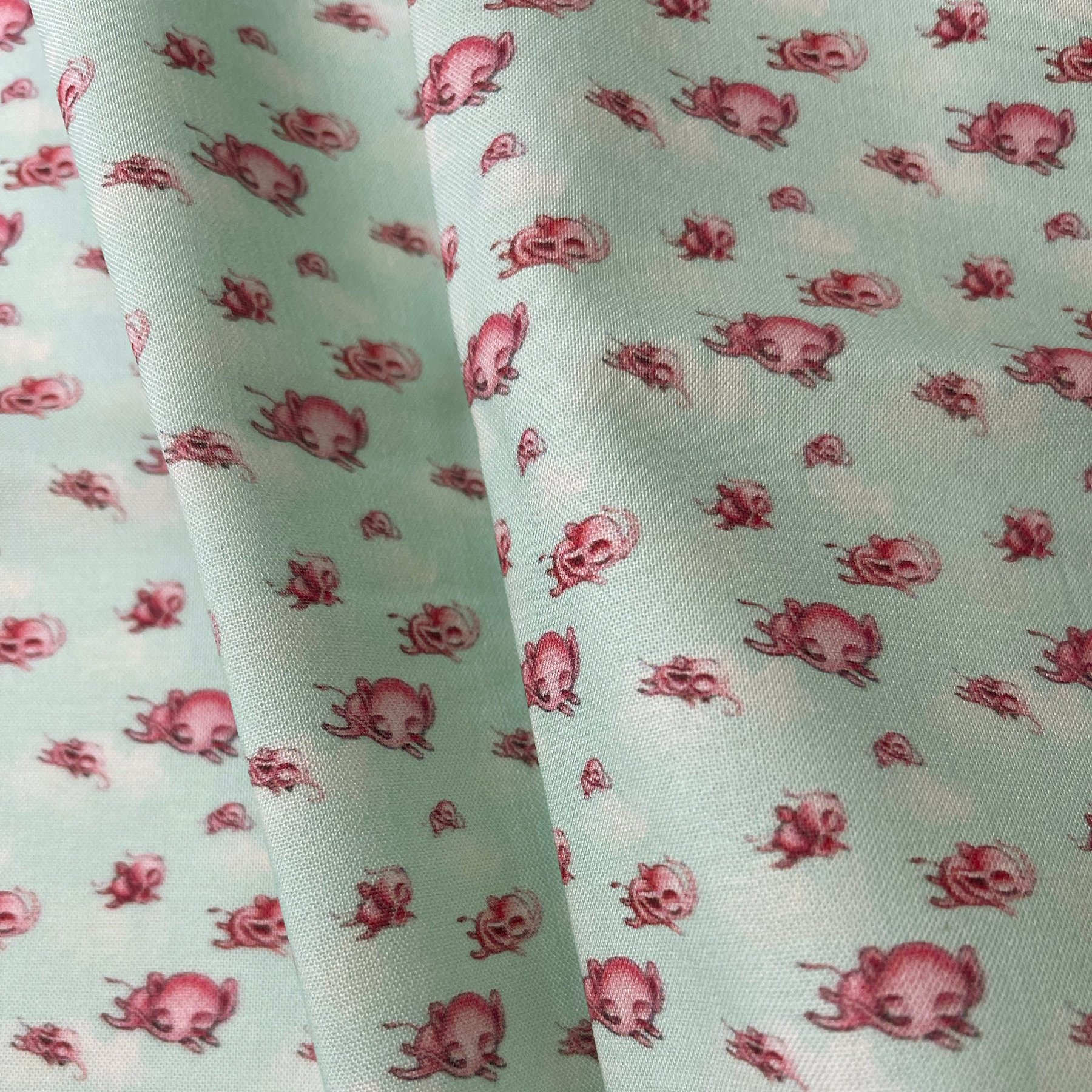 Over the Clouds and Far Away is a small scale fabric design by Laura Colors featuring flying pink elephants in a light teal sky. Printed on 100% cotton, each fat quarter measures approximately 18 x 21 inches. The fabric has a 120 thread count with minimal shrinkage of about 5 - 6%.