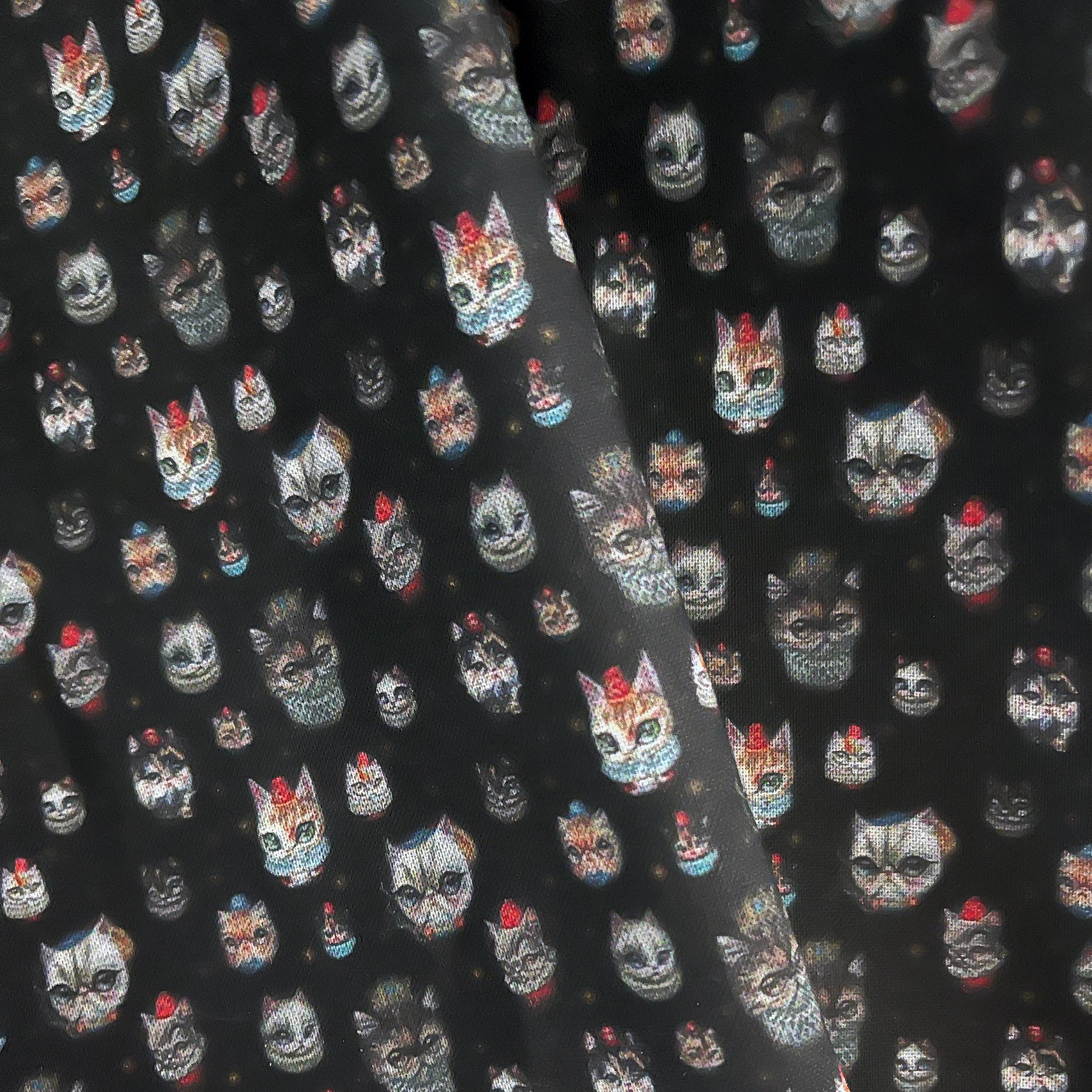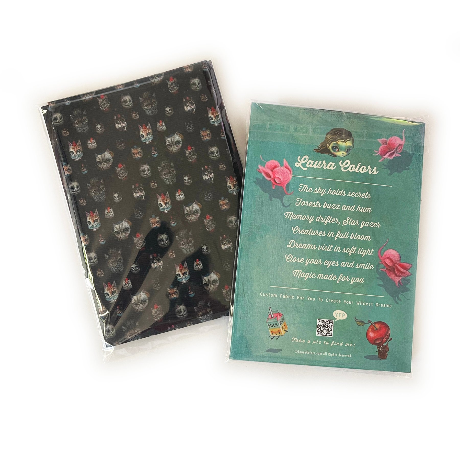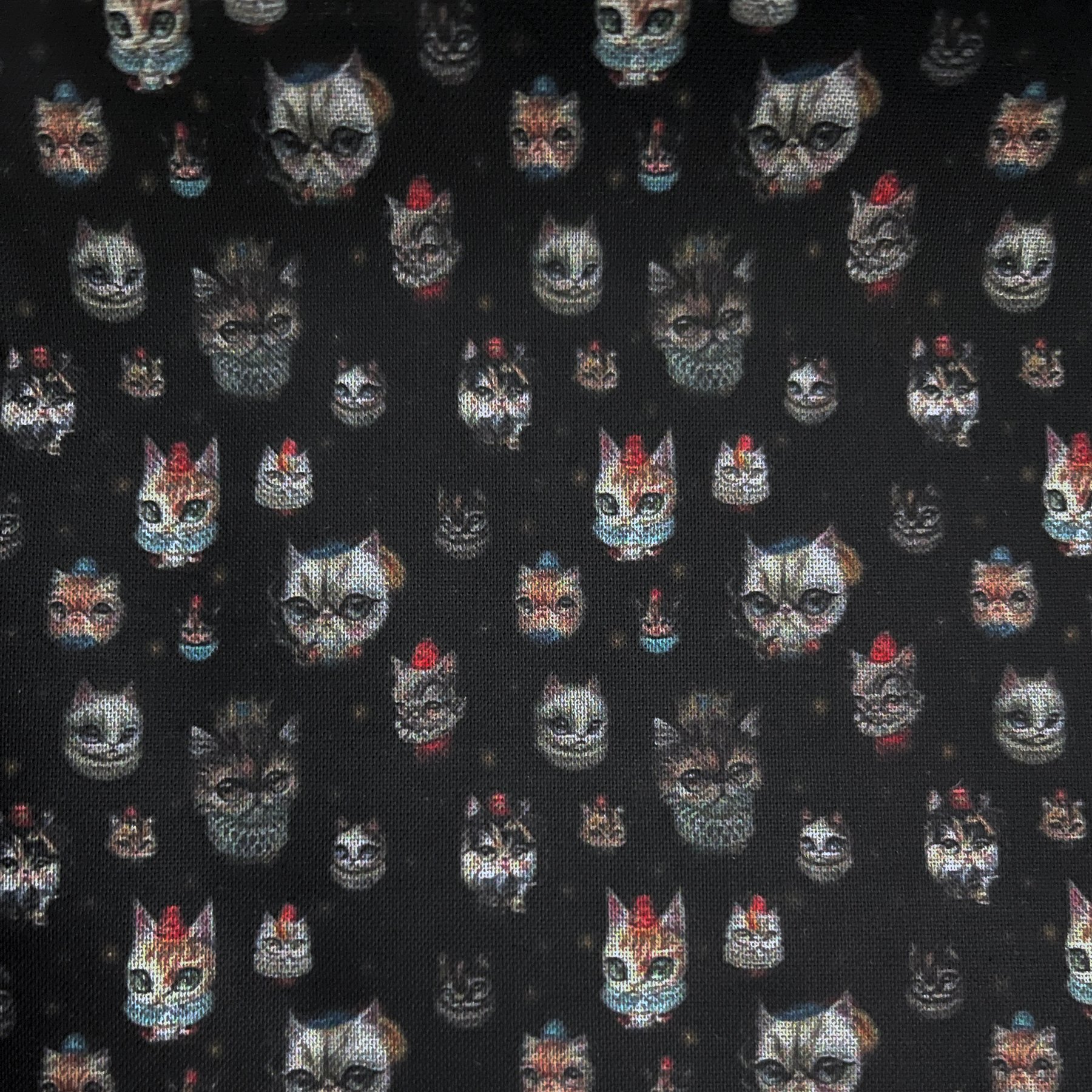 Royal Kittens is a small scale fabric design by Laura Colors featuring kitty paintings outlined and placed on a black background. Printed on 100% cotton, each fat quarter measures approximately 18 x 21 inches. The fabric has a 120 thread count with minimal shrinkage of about 5 - 6%.