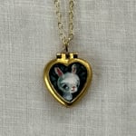 Tiny painted .5 x .5 inch locket with varnished finish. Hangs on an 18 inch 14k gold plated chain with lobster claw clasp.